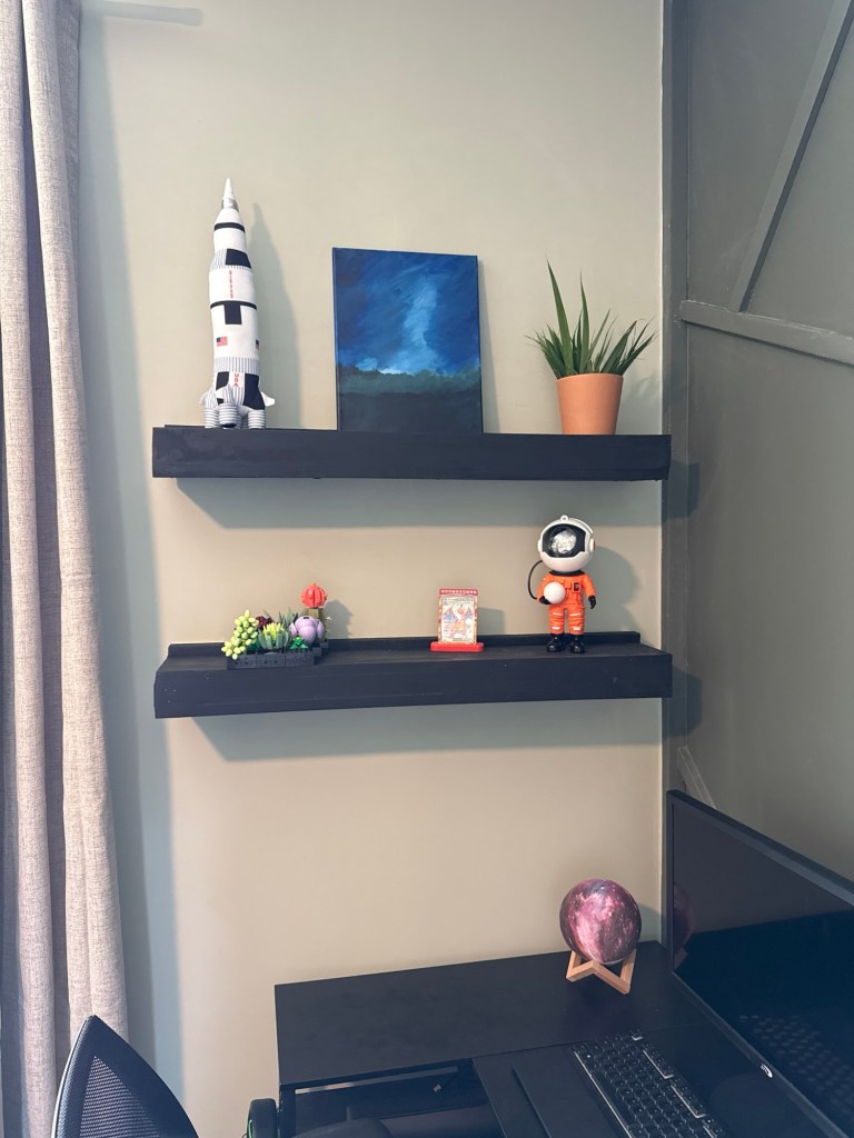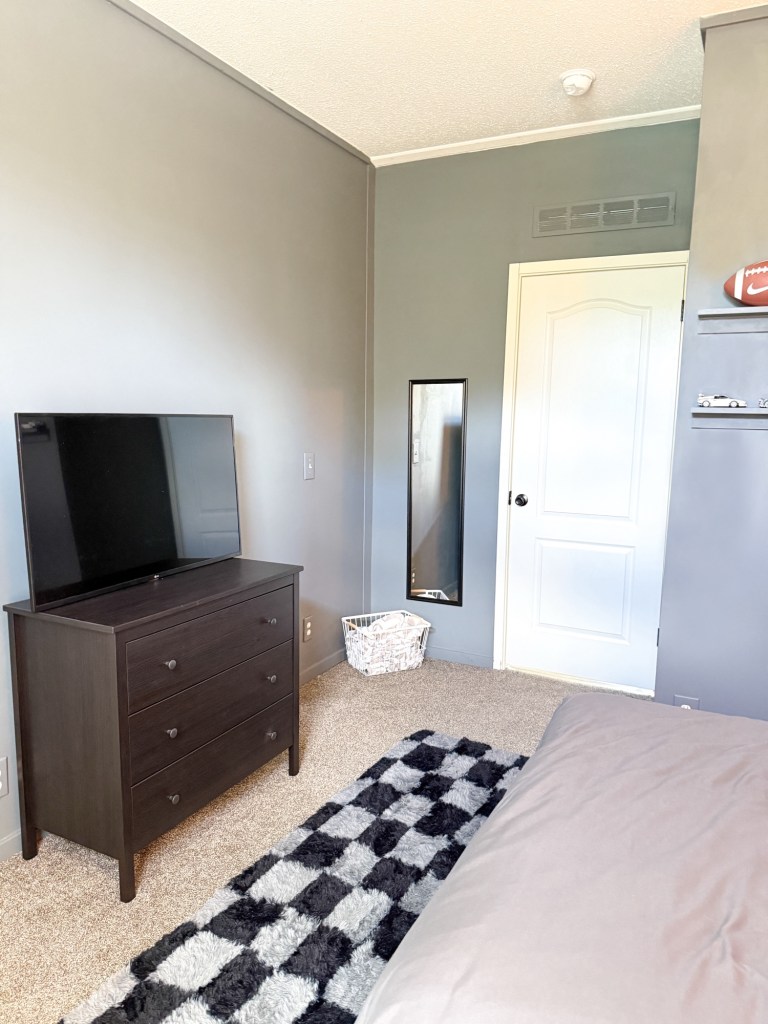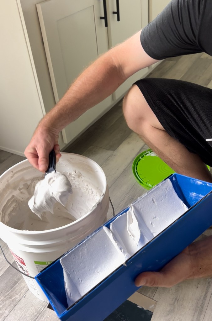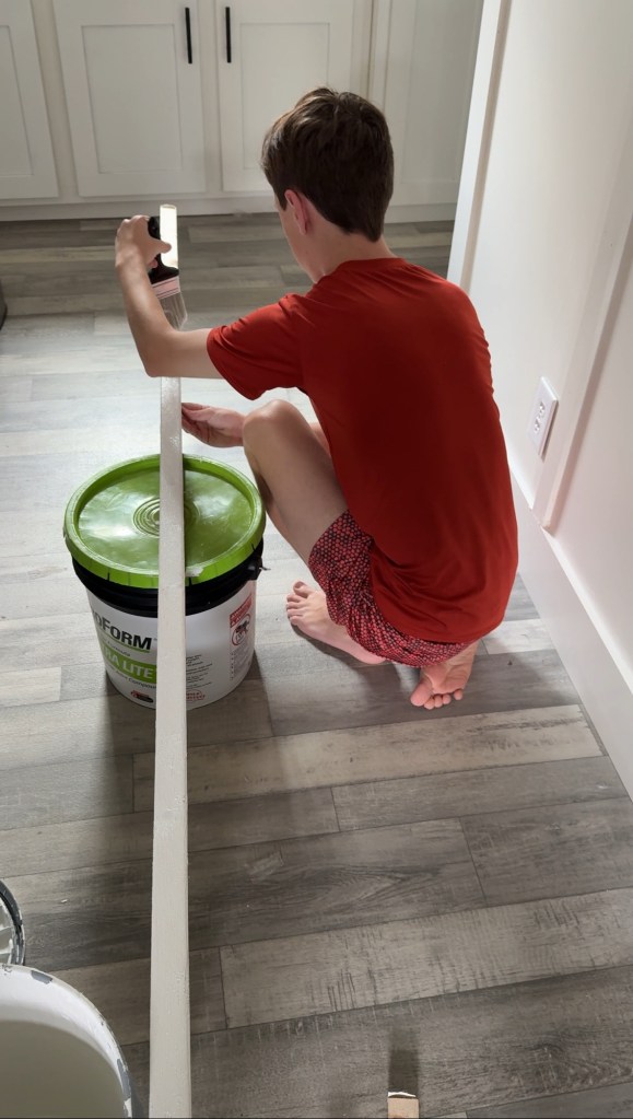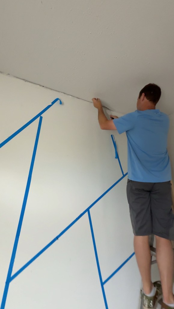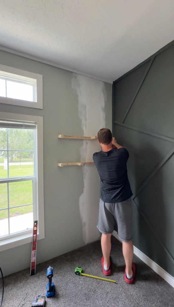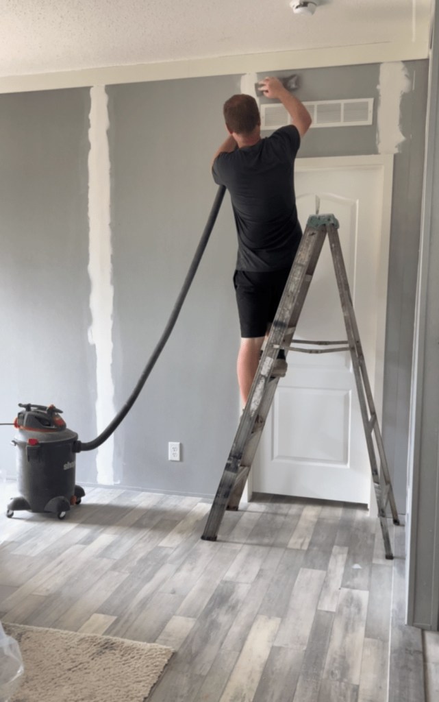 We’re still removing those ugly wall strips and smoothing out the walls. Right now we’re working on Liam’s room, its getting an upgrade with a wood accent wall and some fresh paint. Scroll to the bottom for links on what we used, and don’t forget to watch and like our video!