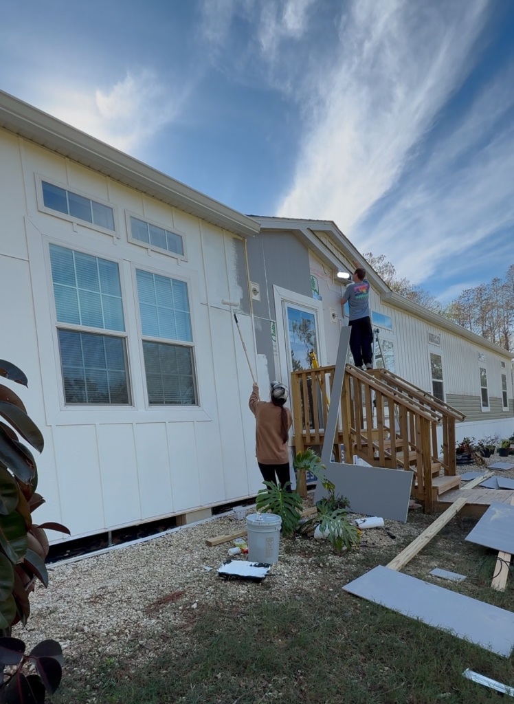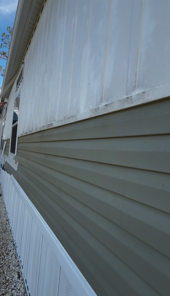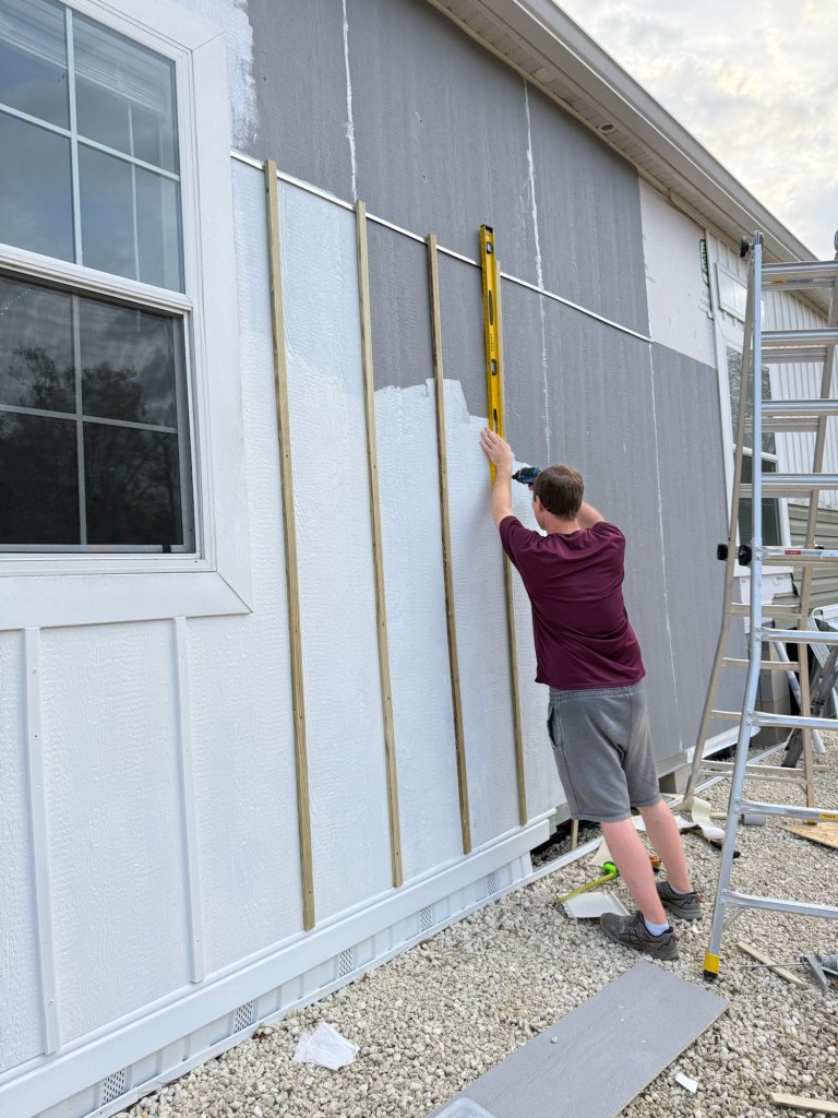 We started by removing the vinyl siding that came with our home. Looking dingy, I held off on washing it because I knew it would be taken down soon. What bothered me the most was all the different directions of the lines, and how high up the skirting was. We also made sure to be extra careful removing the old vinyl siding because it’s getting repurposed on our well house.