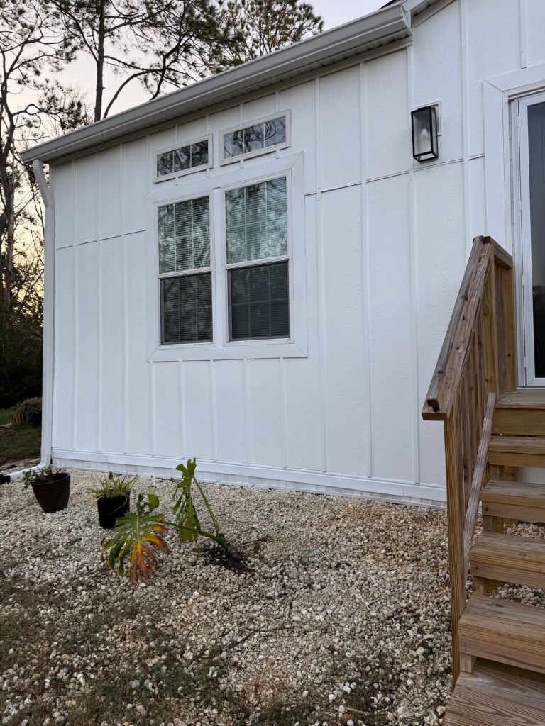 We’ve been working on giving our home a facelift with some Board and Batten siding, and we’re painting it white to give it that Farmhouse style look!