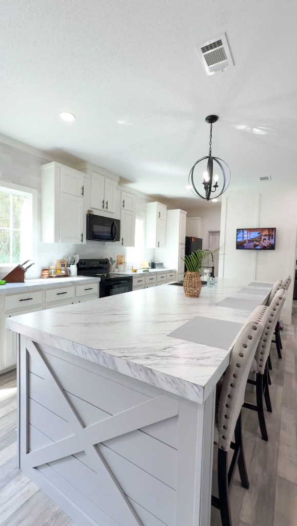 A little more details, it’s 4 bedrooms, 3 bathrooms, and 2254 sqft, plenty of room for our family of five! We love the fact that it has 2 living rooms, a dining area, and an island big enough to fit the whole family (it’s 11.5’ long!)