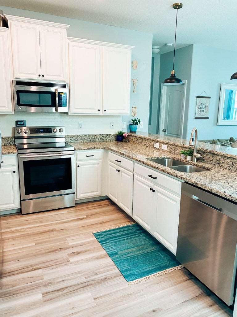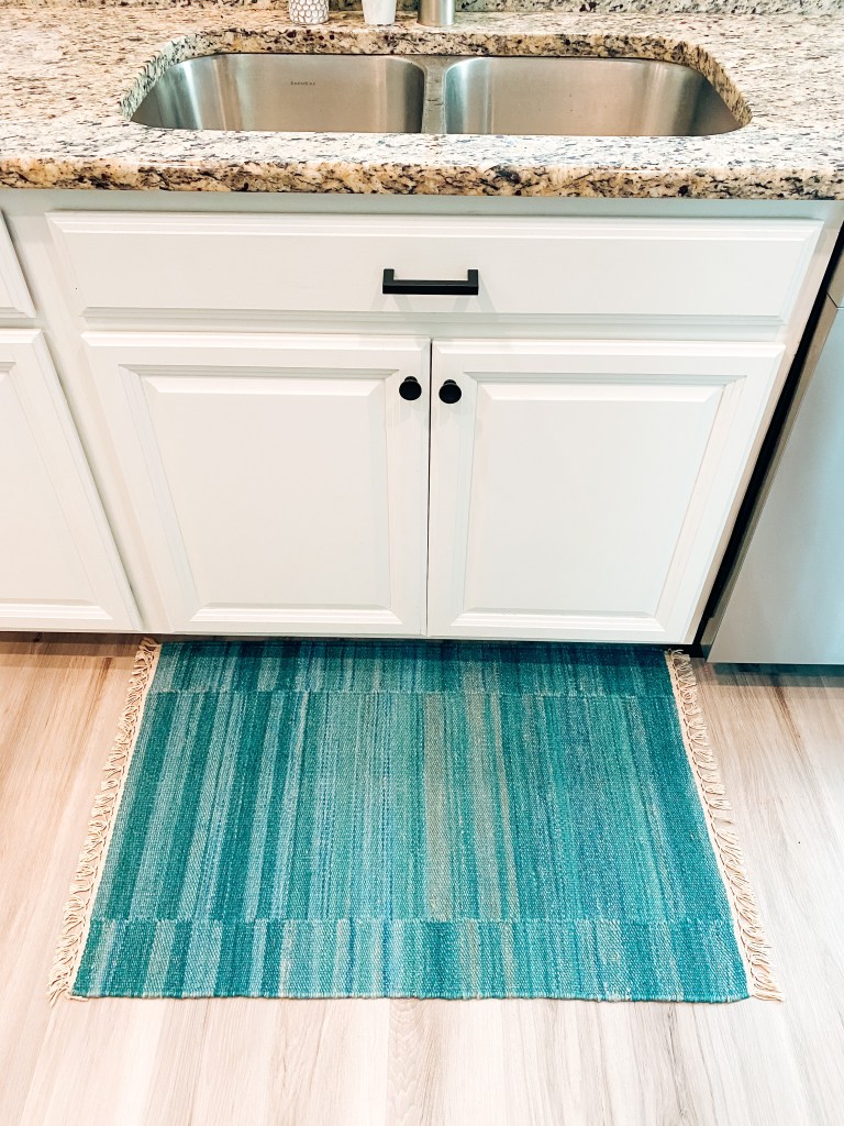 Our kitchen has come a long way from the orange builder grade cabinets and tile floor. I recently moved my rug from The rugs cafe to the kitchen and it got me thinking that I should share with you guys a few recent things we’ve done to spruce it up!