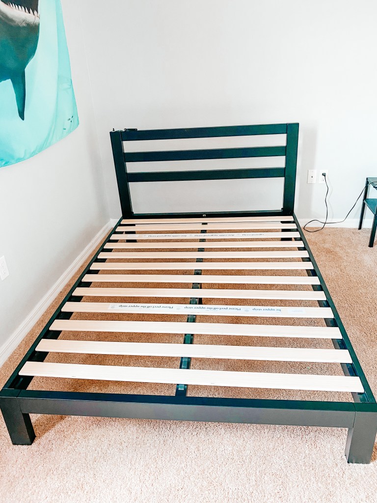 We found the new bed on Amazon, no way was I going out shopping in the stores. The bed and Green Tea infused memory foam mattress arrived 2 days later. We knew the mattress was great because Liam has the same one in his room. My favorite part about the mattress is that it has zero smell straight out of the packaging. Something to do with the green tea infusion Iām sure. In the past we have had bad luck with very smelly out gassing of the memory foam mattresses.