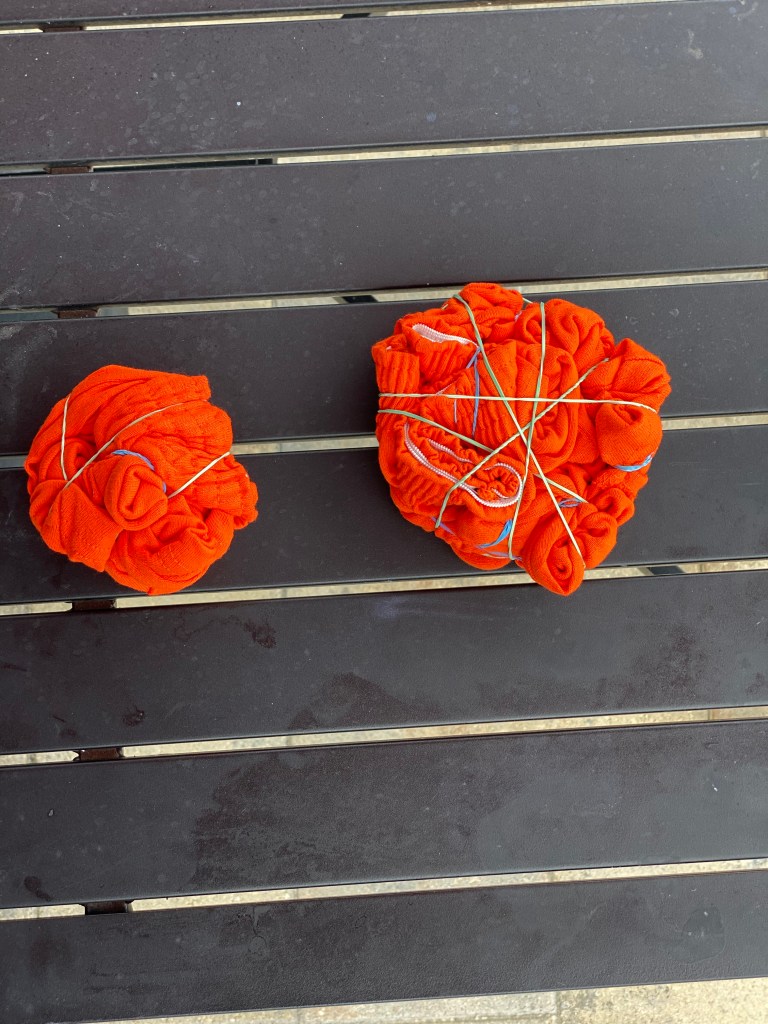Learn from my mistakes!! The orange pair didnāt turn out as dramatic because I didnāt wet the shorts first, and also I didnāt do every OTHER elastic section with the bleach. I was thinking when I tie dye the dye never makes it all the way through the folds in the fabric, but that is not the case for bleach. I still think the orange look great, they came out more of a neon orange with a subtle dye effect.