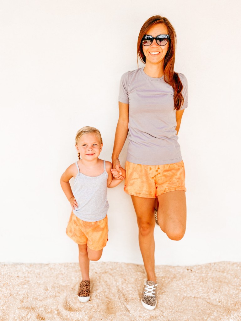 Do you want to have matching mommy and me bleach dye shorts?! I love this because you can customize. Soffe brand carries literally every color so if you donāt like purple or orange, you can do green or blue!