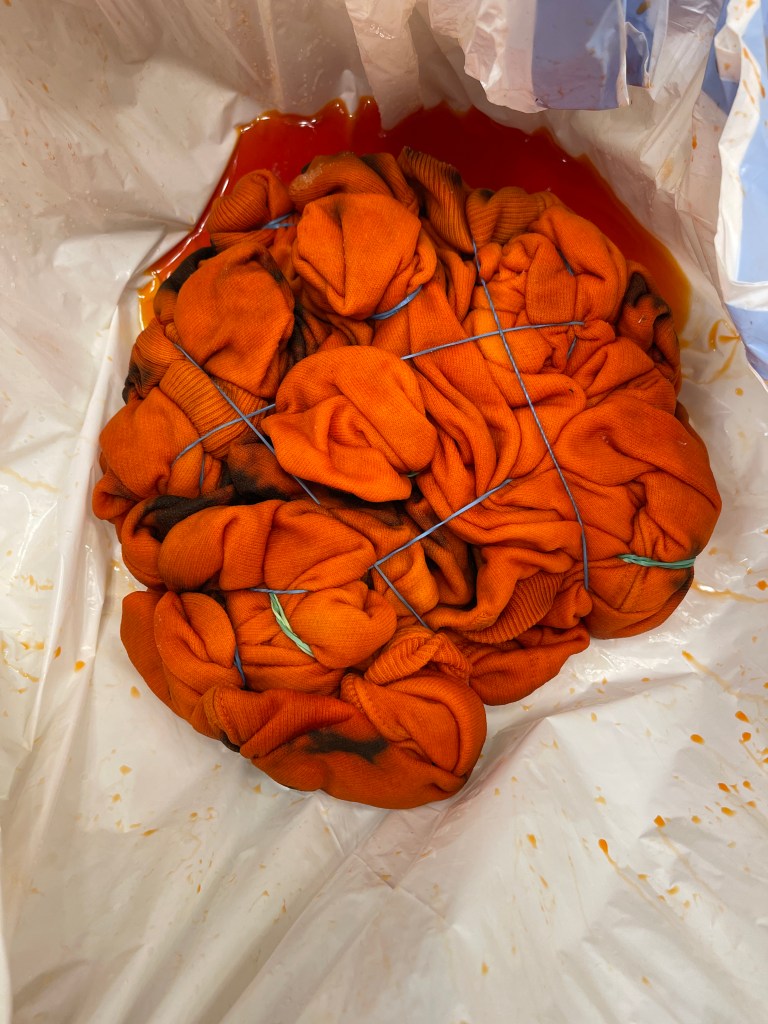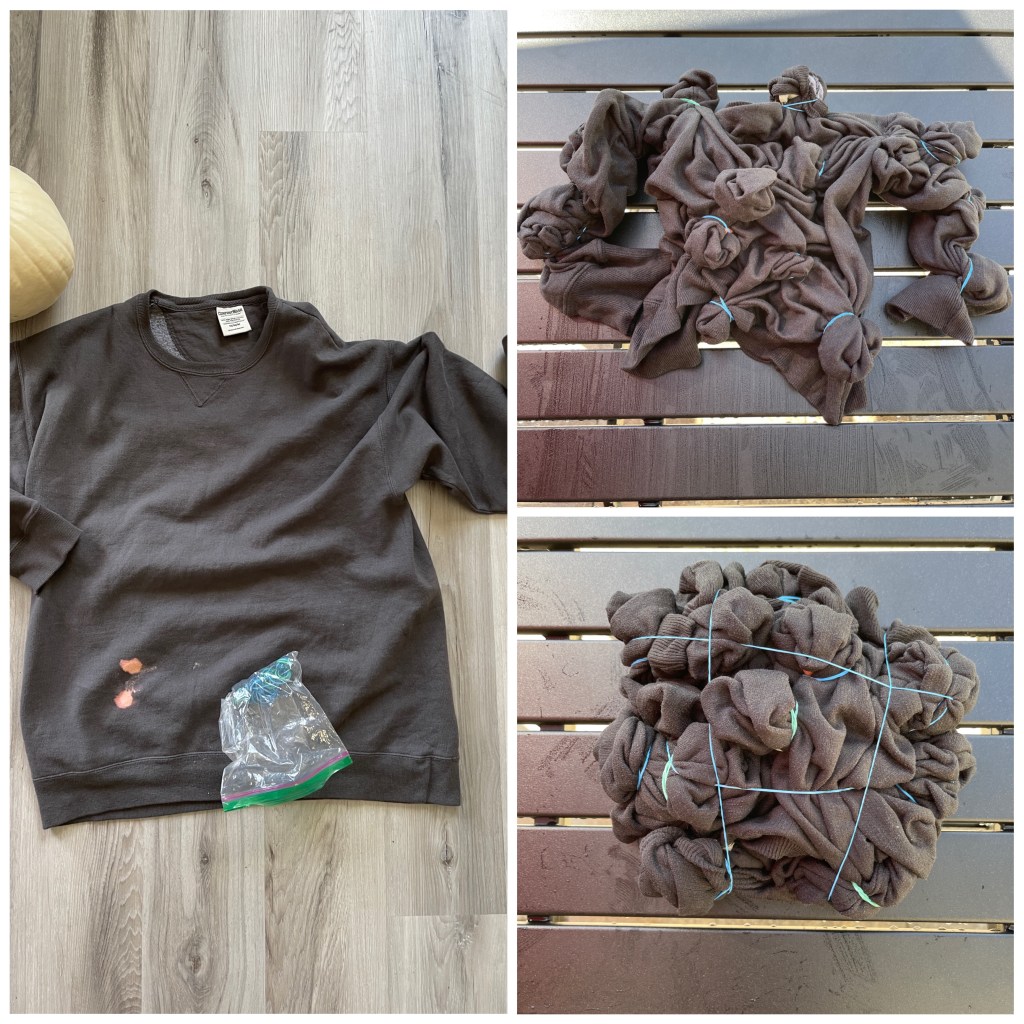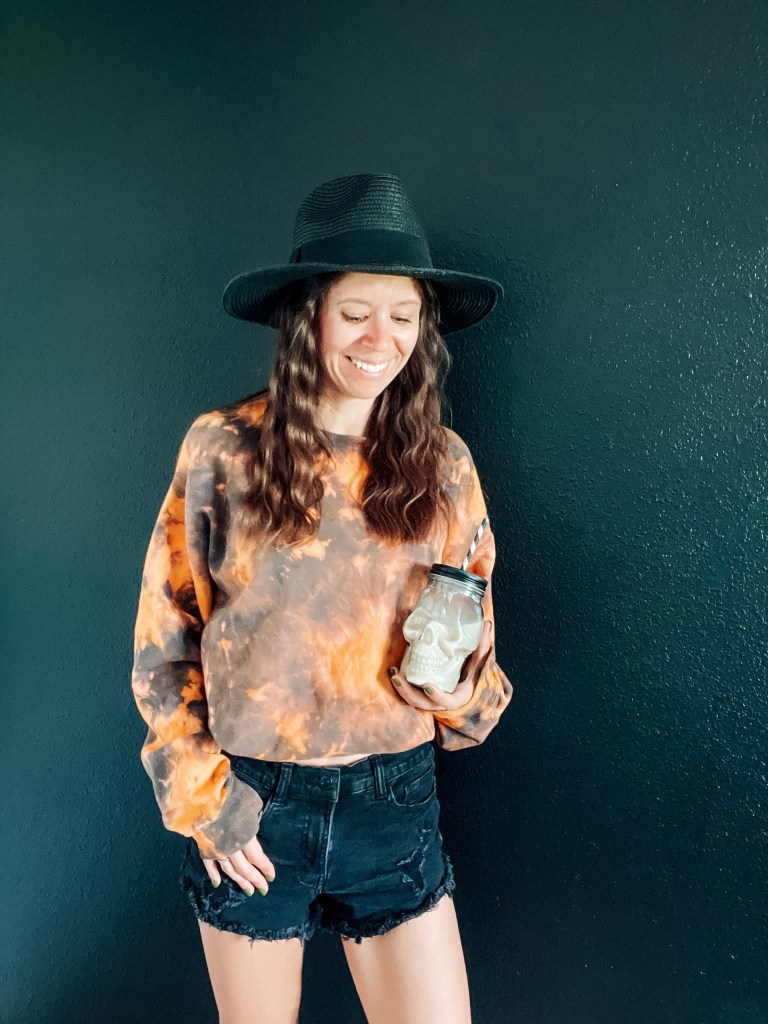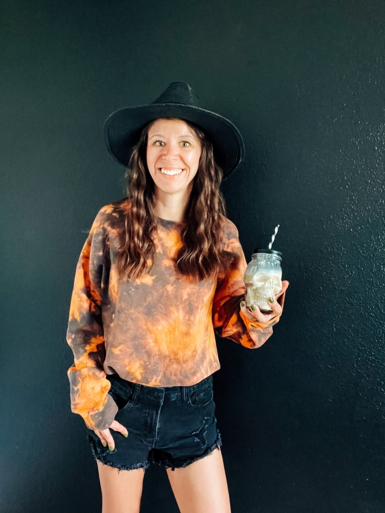 This morning while cleaning I got bleach on my newest color! So I decided to fix it with more bleach and Orange dye to make a Halloween Sweatshirt. Supplies I used were Rit Dye in Sunshine Orange, Bleach, and rubber bands that’s it! The whole process took me about an hour, and then another 40 minutes to wash and dry. I love how it turned out, and I’m calling it a happy accident!
