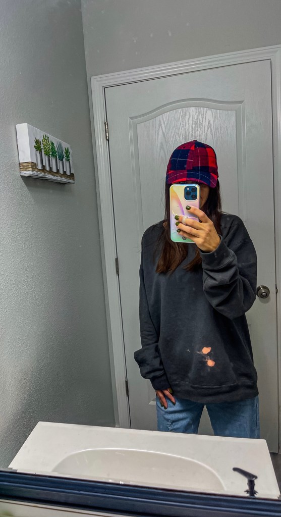 I’m obsessed with the Hanes comfort color sweatshirts! (Linked here) I get them in a size Medium and it gives a nice over sized look.