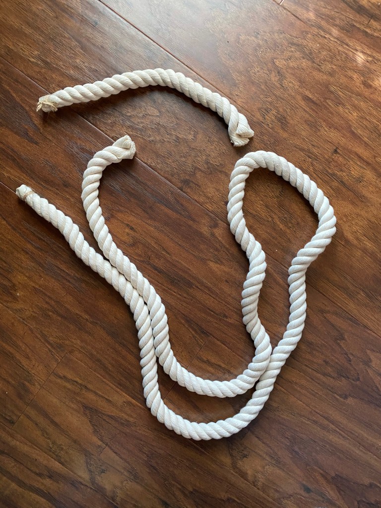 For the cord at the bottom I unwound the rope, cut into 6 inch sections and then folded those in half and frayed the ends To finish I glued the rope into the holes and then covered the bottom 2 inches of the rainbow with the undone rope to coverup the ends
