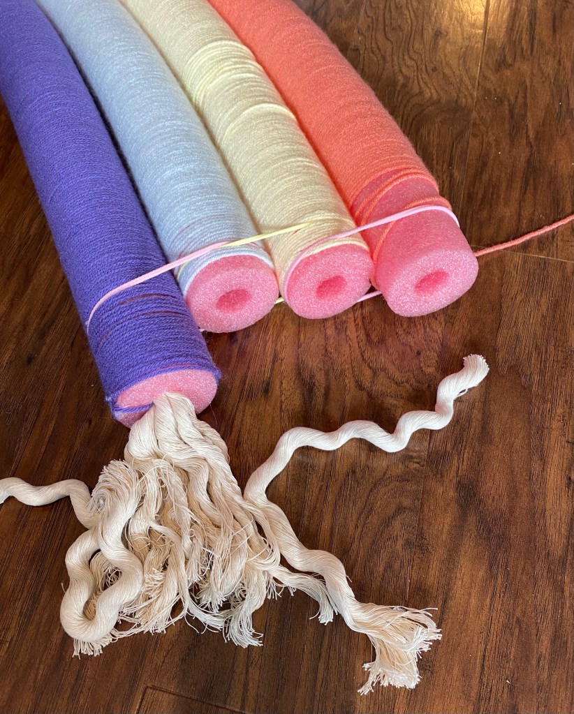 I used the regular sized pool noodles, some hot glue, and yarn colors of your choice! The Drill saves so much time! I found a foam ball from the kids toys and it fit right in the hole, then wedge the largest drill bit I could find in between. I felt like McGyver, but it’s a hack you can appreciate!! The previous rainbow we made, I hand wound and it took days!! I still can’t believe I did that.